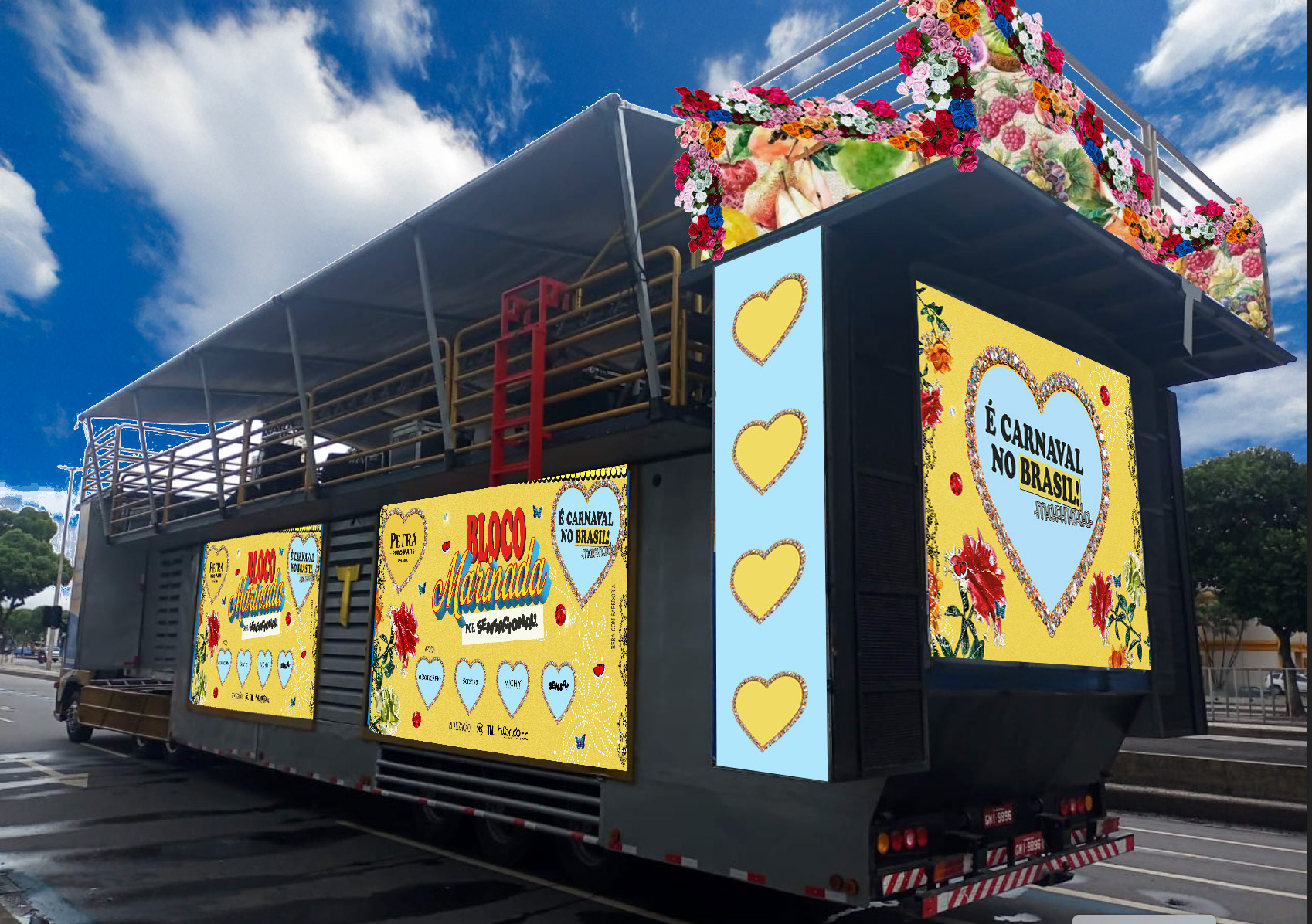 Pensar a cenografia de um bloco é imaginar como a identidade visual, a presença da artista, a música e a energia do público podem se transformar em espaço e experiência. Para este projeto, buscamos criar um cenário vibrante, com elementos que dialogassem com o universo artístico da Marina — colorido, maximalista e com personalidade.
